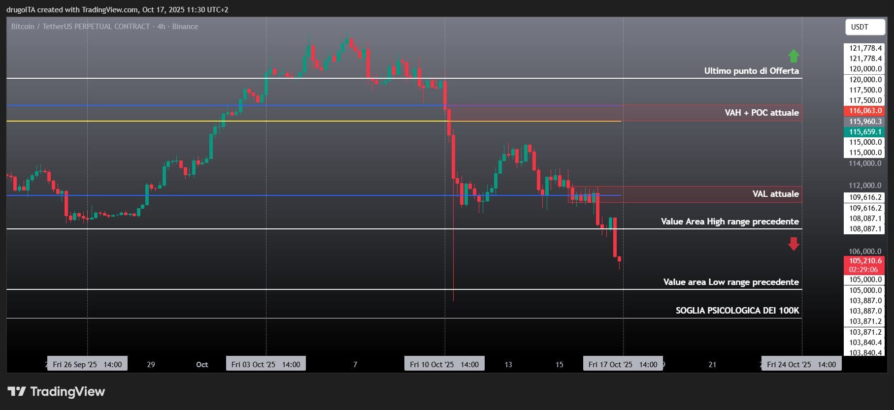 Lato long, un’accumulazione immediata nella zona tra i 102.500$ e i 100.000$ potrebbe fornirci un potenziale ingresso per la continuazione del bull market. Però, a dirla tutta, se i compratori avessero avuto ancora forza per sostenere il mercato avrebbero dovuto già farsi sentire. Infatti, restare al di sotto dei 105.000$ è già di per sé un segnale di estrema debolezza.