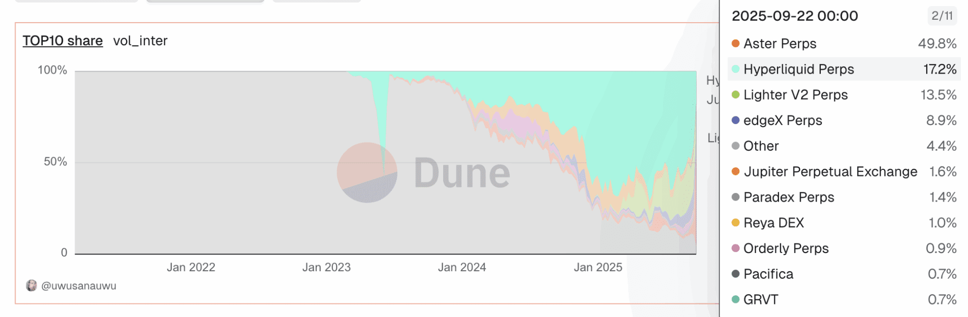 La market share del protocollo, come riportato dai dati raccolti su Dune, ha raggiunto un nuovo record ed ora equivale al 50% dell’intero mercato. Hyperliquid, precedente leader di mercato, ha visto in pochissimi giorni la sua market share calare dal 60% a meno del 20%.