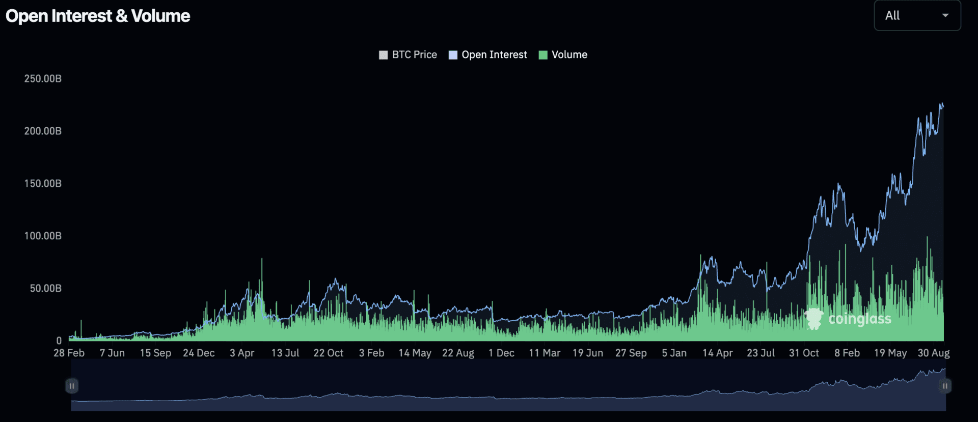 Parliamo infatti di oltre $210 miliardi di dollari ($225 se osserviamo i dati di ieri) di open interest, sui malori massimi assoluti.