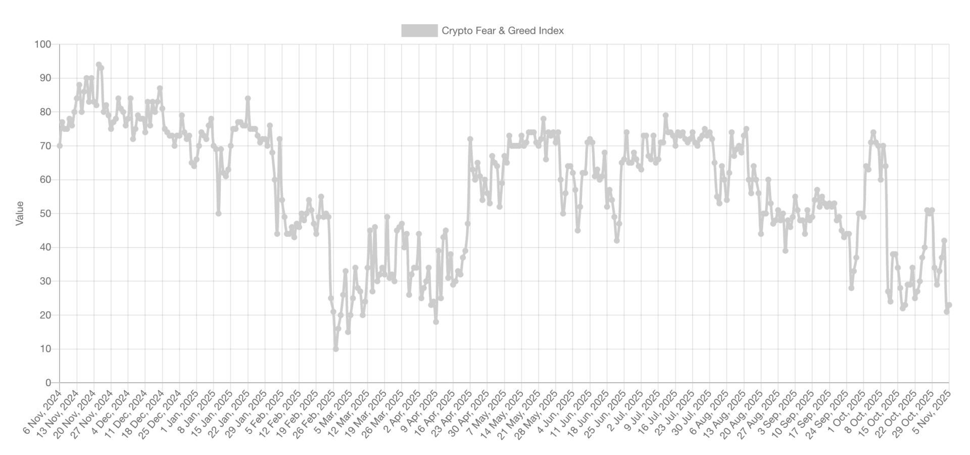 In questo contesto, il sentiment degli investitori diventa sempre più negativo. L’indice Fear & Greed, che indica i sentimenti di avidità e paura, è su un livello di 23, mai così basso dall’inizio di aprile 2025. Un cambio di rotta molto rapido, considerando il livello di 71 del mese precedente, passando così da una fase di euforia ad una di paura in meno di 30 giorni.