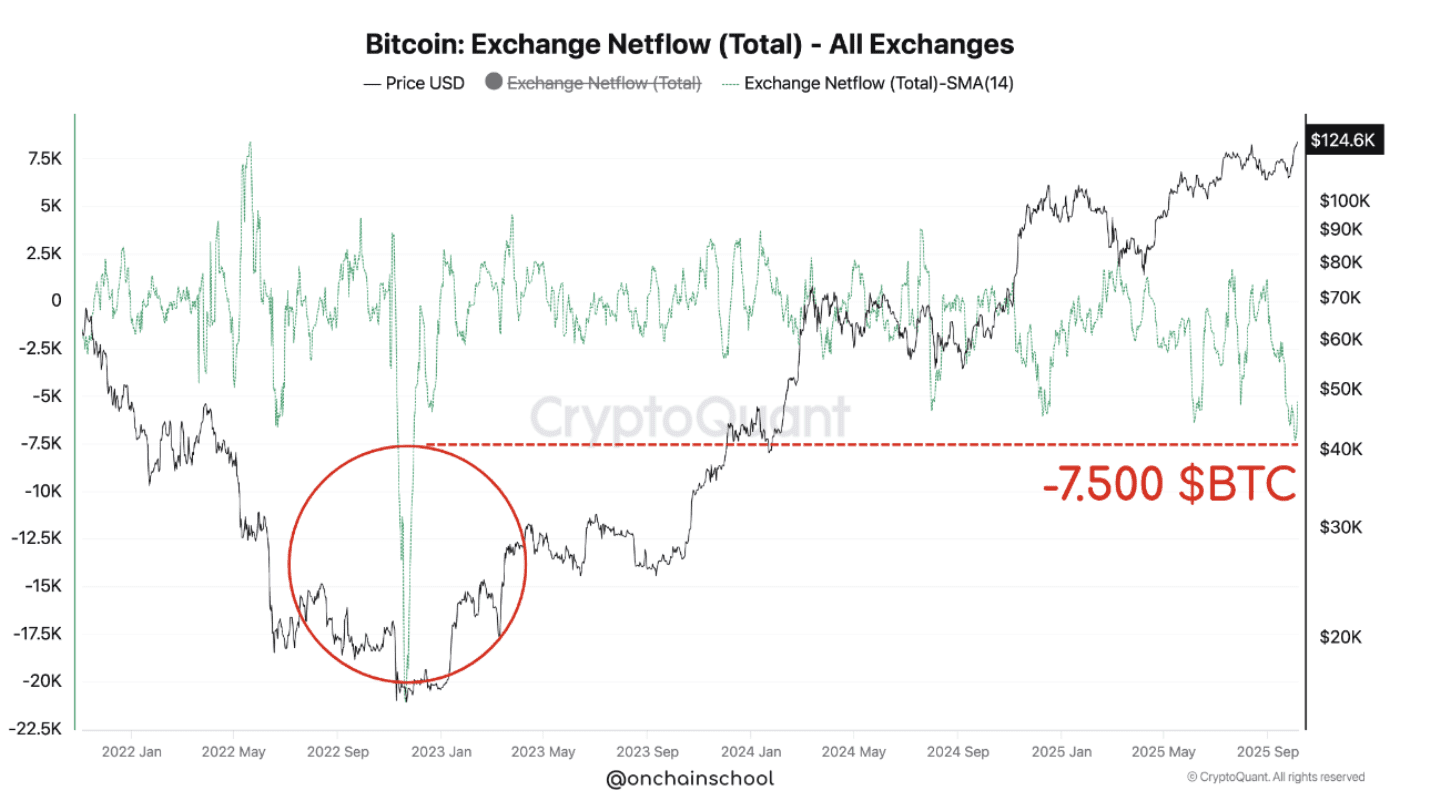 Secondo i dati condivisi da CryptoQuant, la media mobile a 14 giorni degli inflow sugli exchange ha virato in territorio negativo, con oltre 7.500 BTC ritirati nelle ultime due settimane.