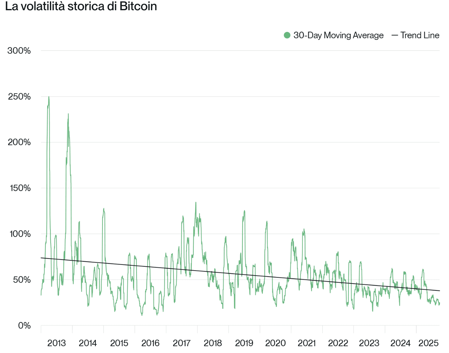 La classica allocazione dell’1% non basta più: con la volatilità in calo e la crescente adozione istituzionale, Bitcoin è diventato un asset “core”, non più marginale in un portafoglio di investimento.