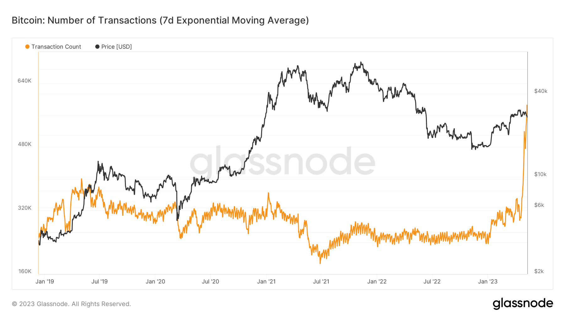Osservando il grafico sottostante notiamo come il numero di transazioni sia esploso al rialzo in seguito all’introduzione dei BRC-20, con livelli mai visti neanche ai picchi del bull-market 2017. Sintomo dell’interazione sfrenata da parte degli speculatori con queste funzionalità, ma anche dimostrazione del fatto che questo protocollo innovativo abbia intrinseco in sé stesso un problema di spam.