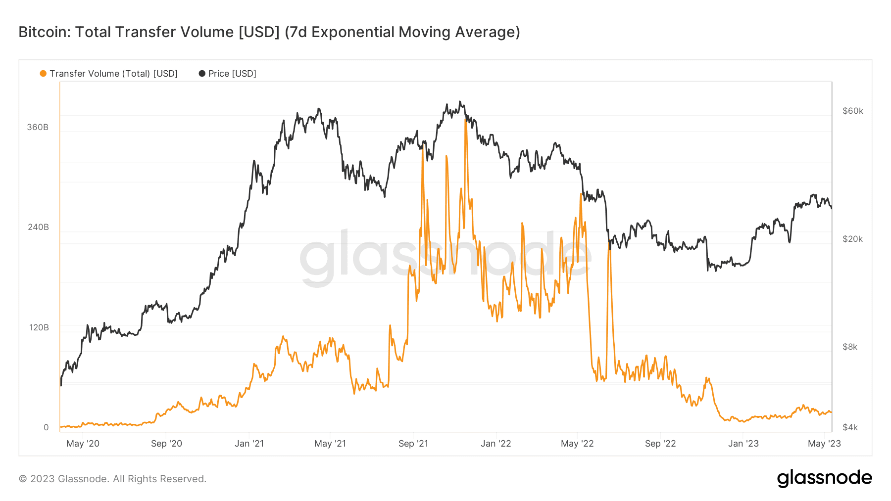 Notiamo come, se il numero di transazioni è notevolmente aumentato, il volume mosso all’interno di queste transazioni ancora fatichi a recuperare i valori precedenti al crollo di FTX e Alameda.