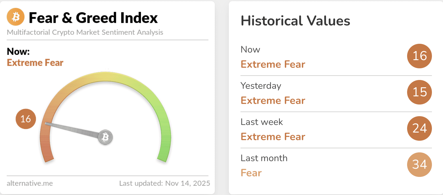 Estrema paura mostra l’indice fear and greed, ad un valore di 16 punti, in una piena rappresentazione del sentiment di mercato.