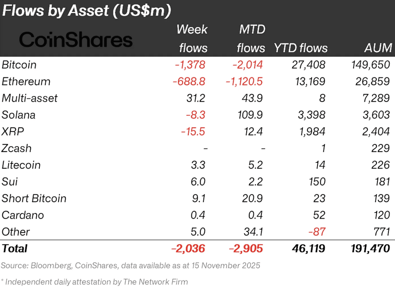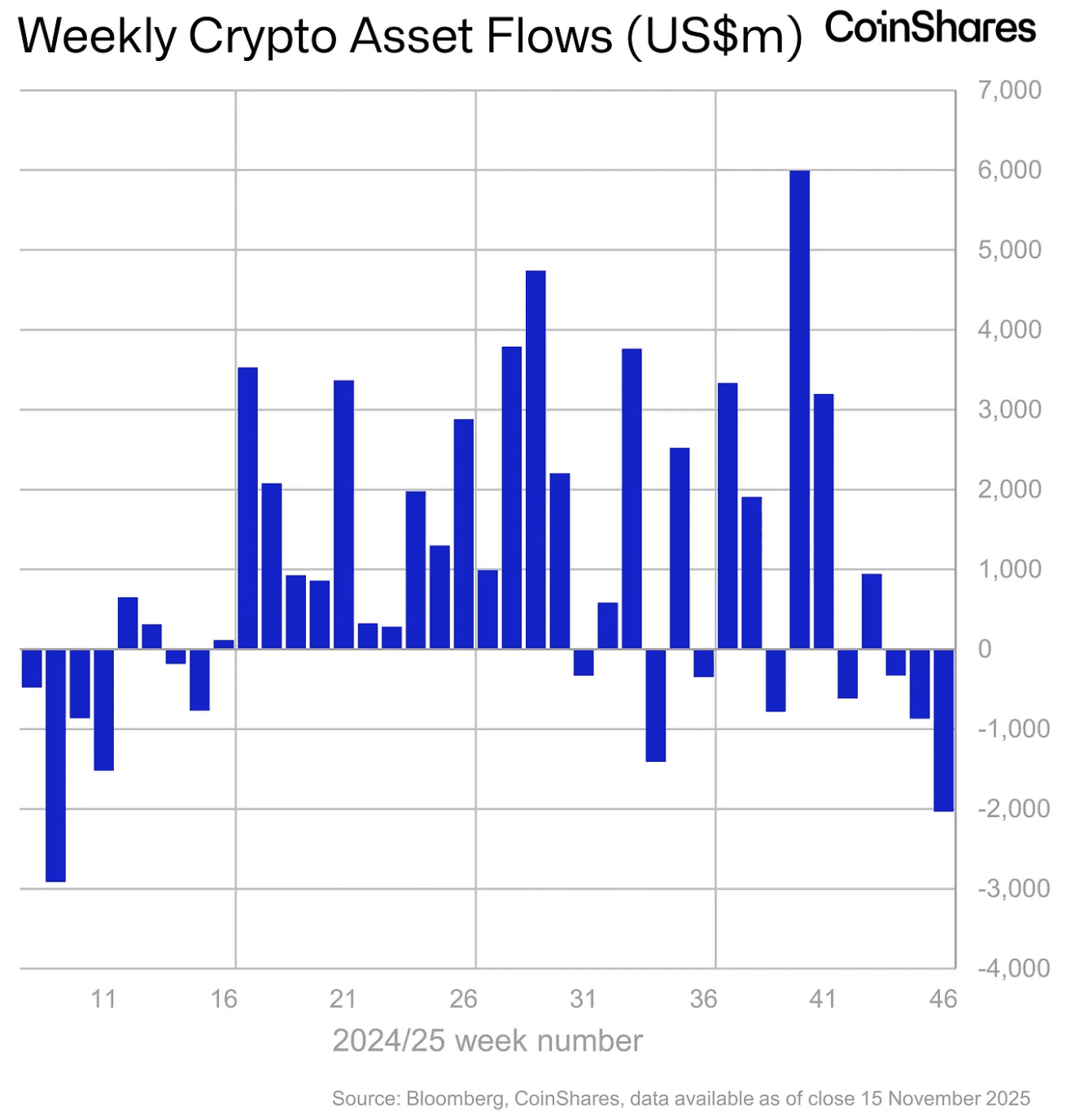 Nell’ultima settimana, i prodotti di investimento crypto e Bitcoin hanno registrato outflow per oltre $2 miliardi. Un numero del genere non si registrava dallo scorso febbraio, e va ad aggiungersi a due settimane che già svelavano un trend negativo. In questo modo, da fine ottobre sono già 3,2 i miliardi di dollari in uscita dal settore.
