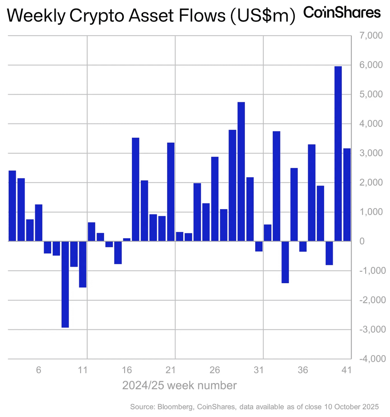 Nella settimana appena passata, i prodotti di investimento crypto hanno registrato afflussi per $3,17 miliardi. Questo, come segnalato da CoinShares, nonostante la significativa correzione dei prezzi causata dalle parole di Trump contro la Cina e la minaccia di nuovi dazi.