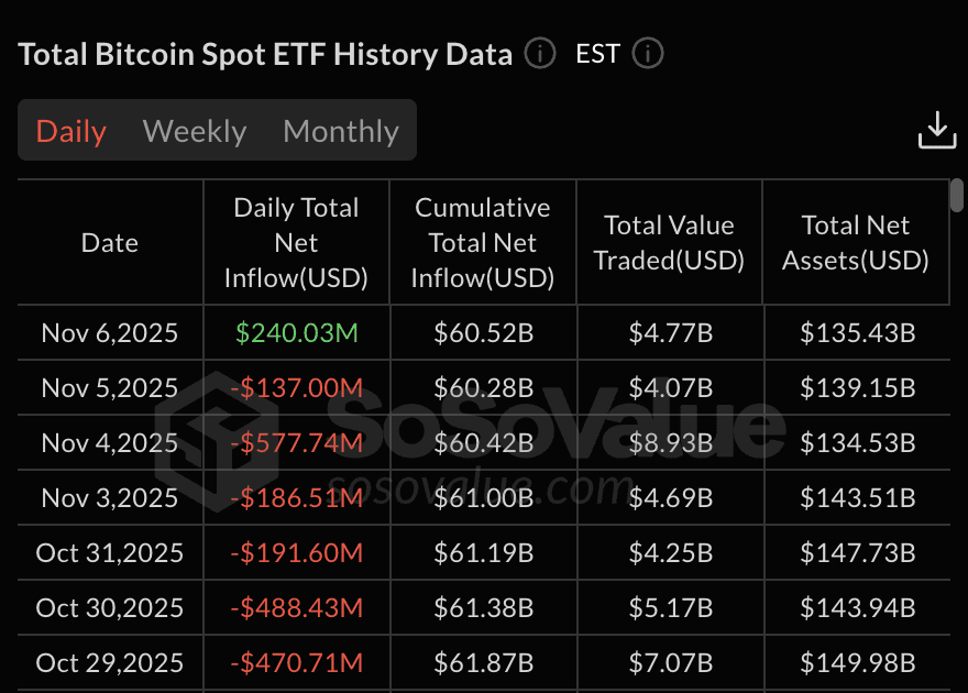 Dopo giorni di svendite e ribassi di prezzo, i flussi tornano positivi: +$240 milioni su ETF Bitcoin ma il prezzo soffre ancora