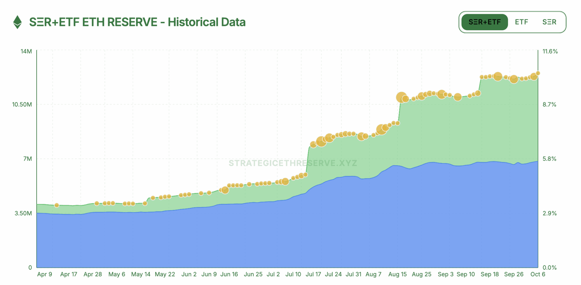 L’adozione istituzionale prosegue e continua ad alimentare il rally delle crypto più capitalizzate. E con un ritmo senza pari per quanto riguarda Ethereum visto che, secondo i dati riportati da StrategicETHReserve, la quota di ETH detenuta da ETF spot e treasury company, avrebbe superato il 10% dell’offerta totale, con 12,48 milioni di ETH.