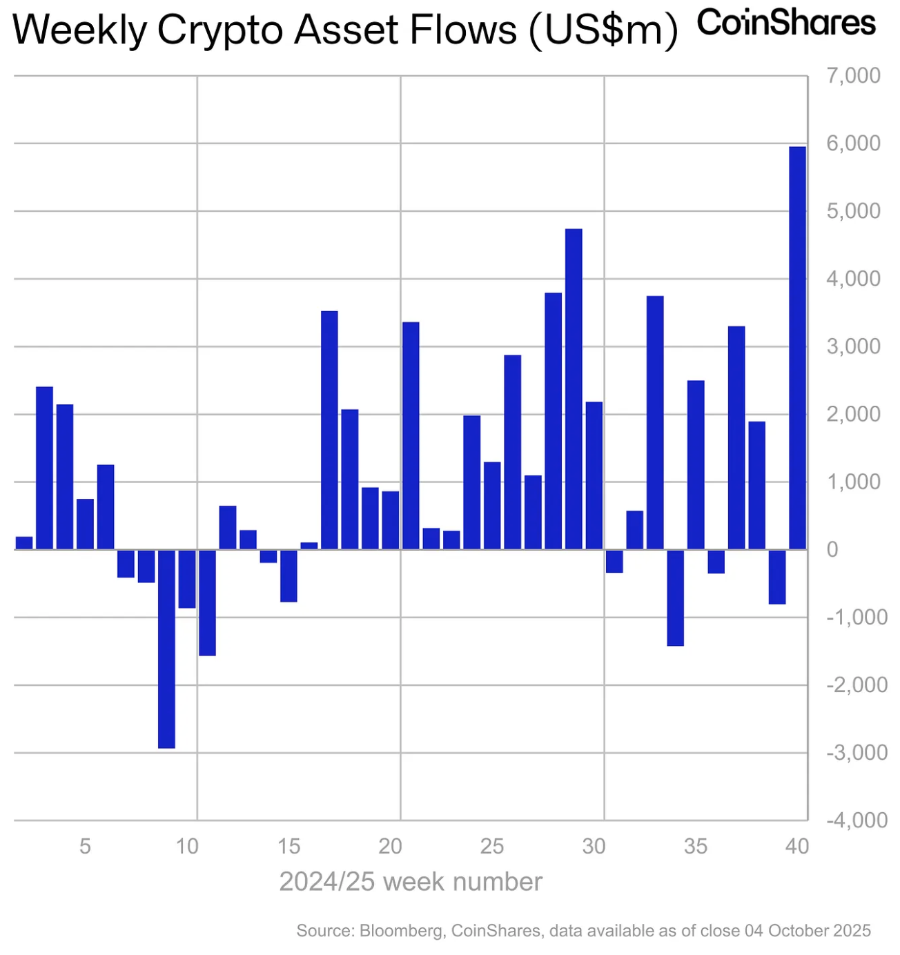 E non sono numeri da tutti i giorni. I prodotti nel loro complesso, come riportato da CoinShares, hanno registrato inflow settimanali da record, ovvero 5,95 miliardi di dollari. Parliamo degli inflow su 7 giorni più rilevanti mai registrati, in risposta a una politica monetaria più favorevole (vedi ultimo FOMC) ma anche a una stabilità del governo Usa messa in crisi dopo lo shutdown della scorsa settimana.