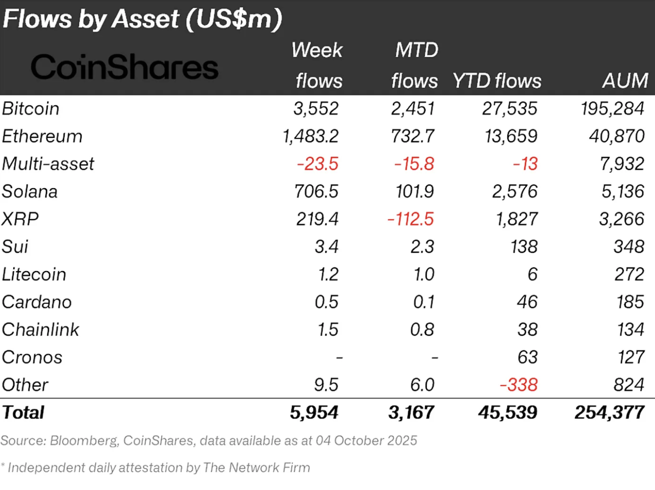 Tra le altcoin, nuovi record riguardano Solana, con inflow settimanali mai visti prima e che superano i $700 milioni, portando gli afflussi da inizio anno a $2,58 miliardi. XRP ha registrato invece inflow per $219,4 milioni.