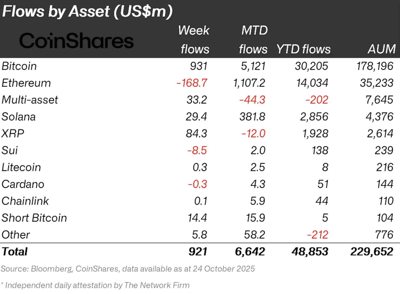 Guardando gli asset, Bitcoin è quello più attrattivo con inflow per $931 milioni, che portano gli afflussi cumulativi dall’ultimo taglio ai tassi di interesse Usa a $9,4 miliardi. Da inizio anno, invece, gli inflow ammontano ora a $30,2 miliardi.