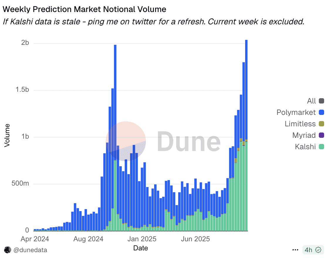 Il contesto in questo momento, non potrebbe essere più favorevole. Dopo l’enorme rally avuto nel periodo delle elezioni USA nel 2024, i prediction market hanno visto una contrazione nel primo semestre del 2025, salvo poi recuperare terreno con gli interessi.