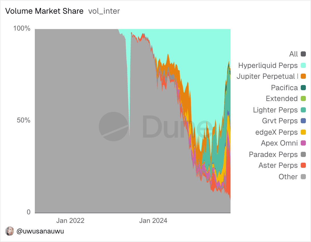 Nelle ultime 24 ore infatti, con quasi $74 miliardi di dollari scambiati, Lighter ricopre la prima posizione per market share con il 22.2% dell’attività, superando Hyperliquid che ha scambiato il 21.7% dei volumi complessivi.